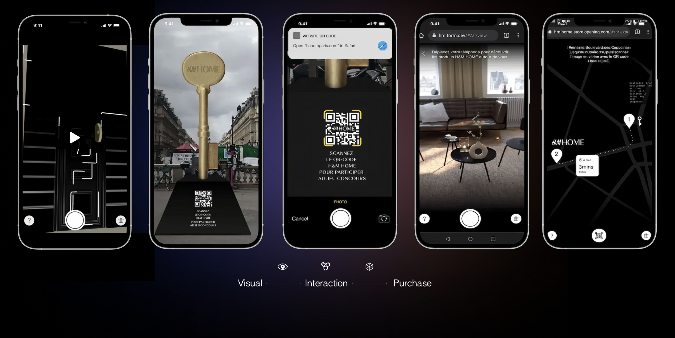 Participants could scan a QR code on the installation to launch the H&M Web AR mobile app directly in their browser — no downloads required. Once activated, users saw a digital version of the key appear in augmented reality, mirroring the real installation. The digital key acted as a compass, guiding them toward the new H&M Home store through real-time navigation powered by 8th Wall’s world tracking technology.